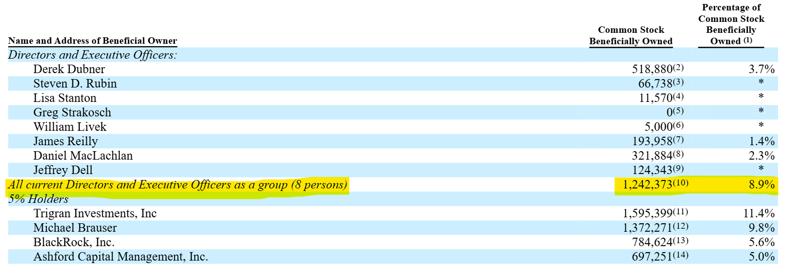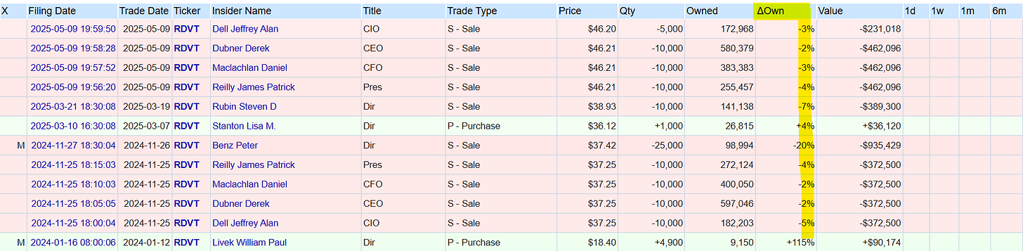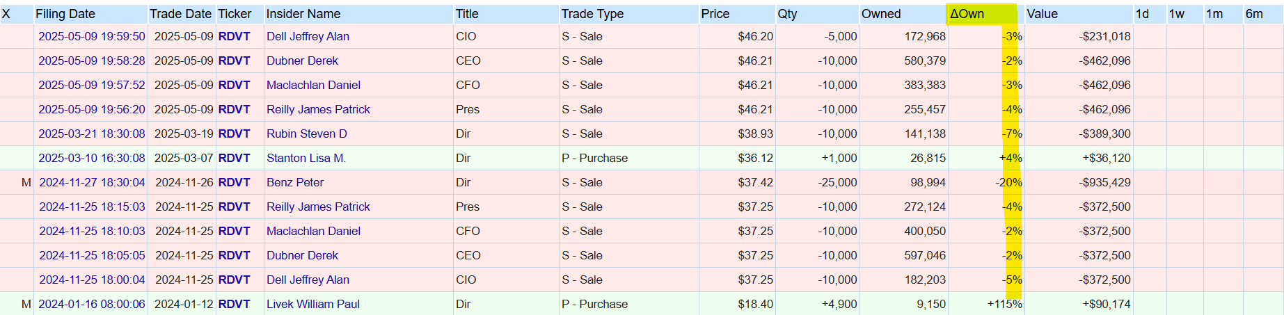 RDVT is debt-free and has a clean capital stack, with only one share class outstanding. Common shareholders are right in line next to management with stock ownership; management owns 9% or so and they rarely sell shares, and in small size when they do, which is encouraging.