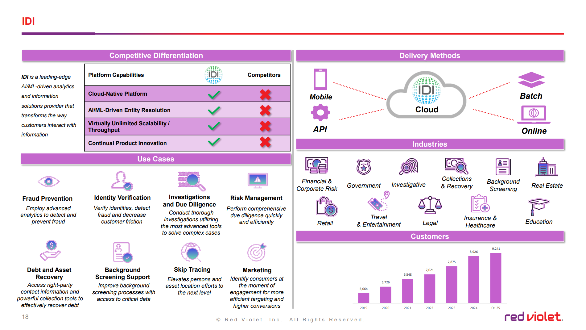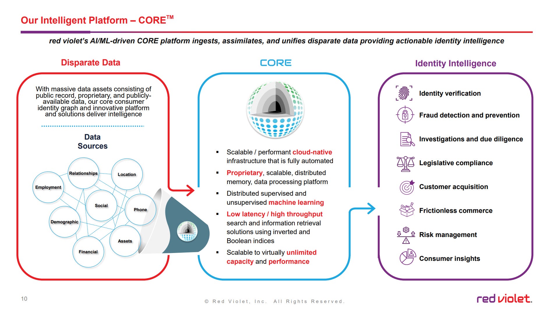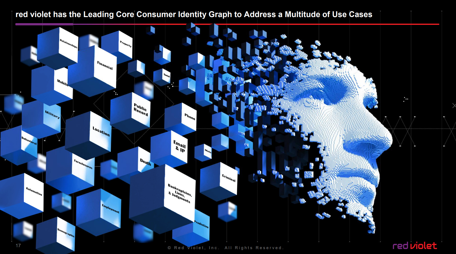 RDVT is a data broker and identity intelligence company that serves a number of verticals, from corporate risk and fraud prevention, to law enforcement, collections, and real estate. The company’s IDI database product is powering numerous federal and state level agencies, thousands of corporate customers, and seven of the top ten identity verification companies today, with significantly more growth potential in these markets.