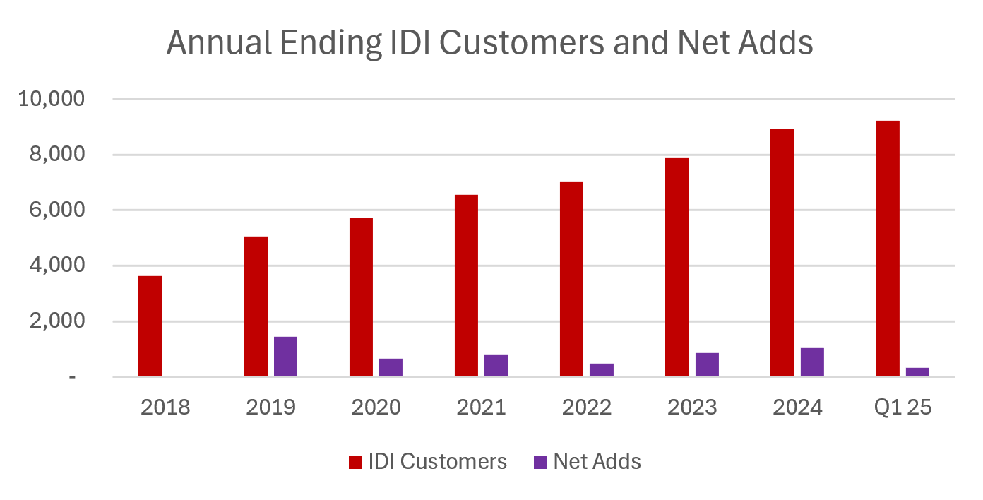 Thus, we know the remaining quarterly revenue (roughly, these are estimates) is coming from IDI with its 9,064 ending quarterly customers and significantly higher ARPU. That puts IDI at around ~$2,000 in revenue per customer per quarter.