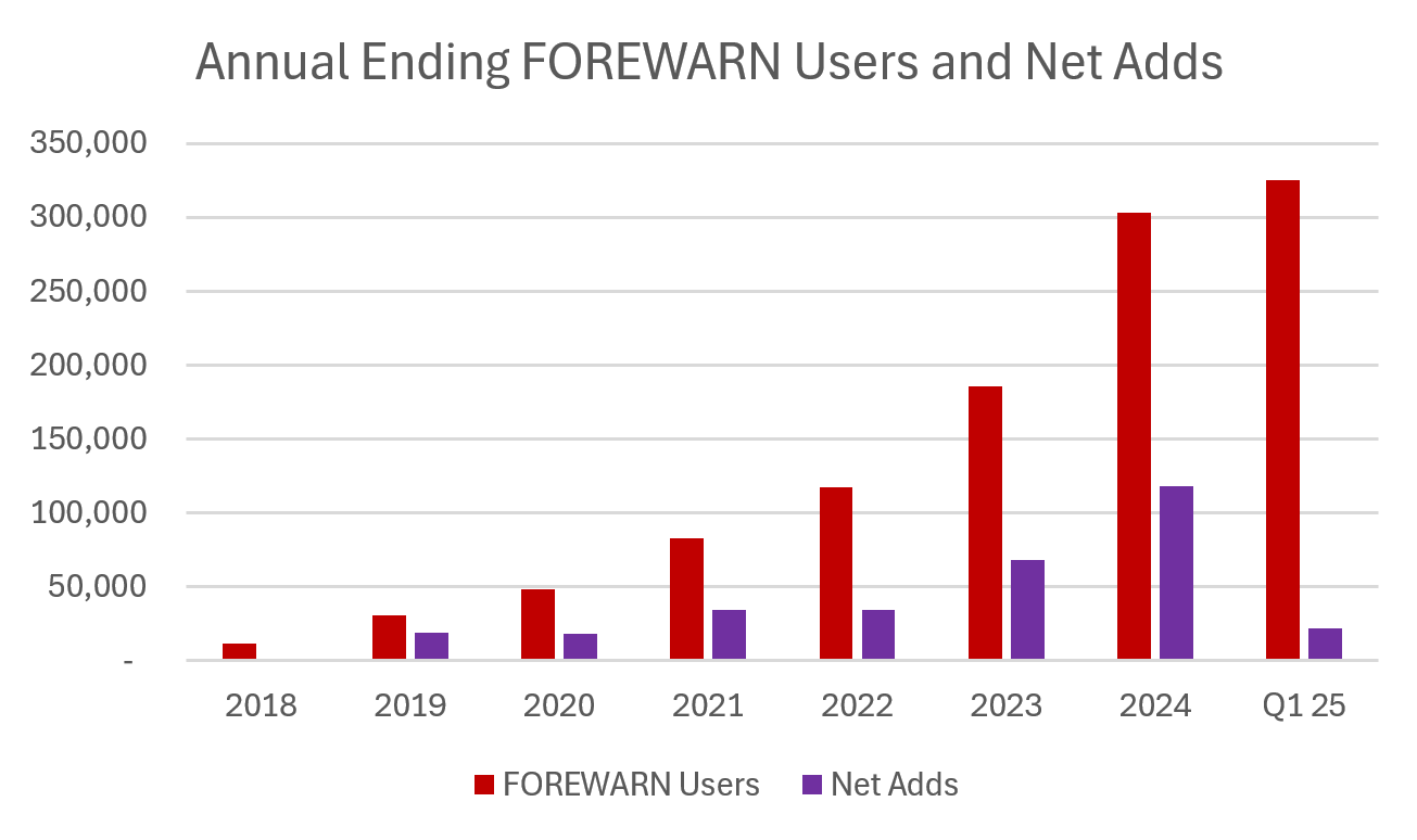 FOREWARN is rapidly penetrating the realtor associations market and is essentially a monopoly product as a preventative solution. There are competing products like panic buttons, but those typically are activated after an adverse event has occurred, whereas FOREWARN is a preventative solution that filters out potential adverse events before they occur. If FOREWARN keeps growing like it is, it could penetrate the remainder of the market within a few years.