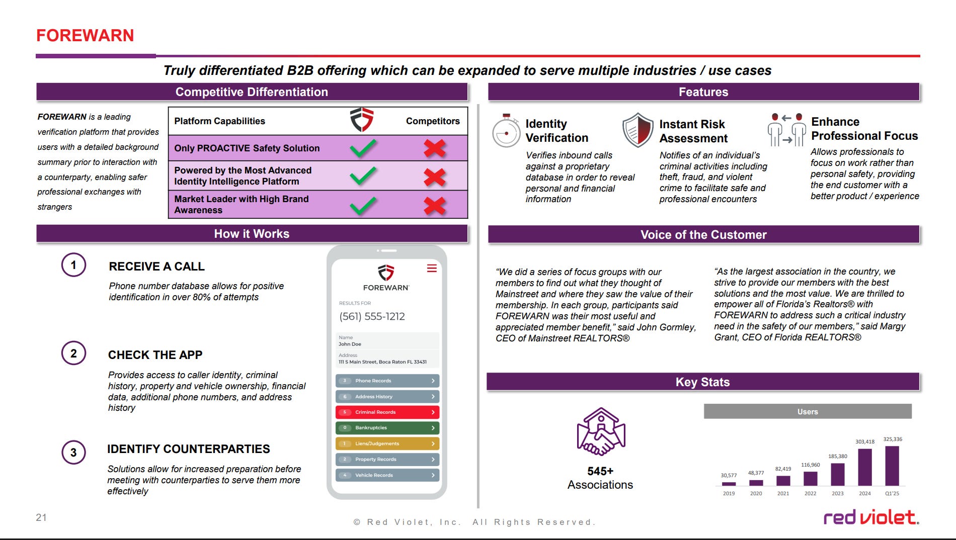 RDVT’s second main product line is FOREWARN, a safety and know-your-customer app tailored to realtors and the real estate industry. This is essentially just a version of the IDI database that runs on a mobile app, but it uses the same core technology that powers IDI and all of RDVT’s other identity solutions.