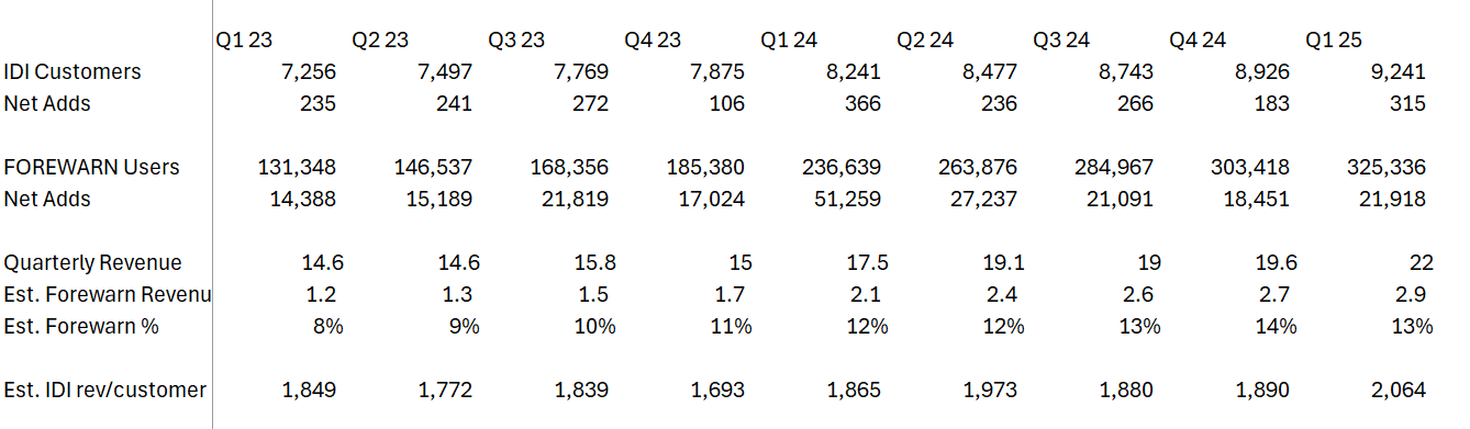 IDI is adding customers at a 17% 6-year CAGR, and assuming FOREWARN is priced at an average of $3/user, my napkin math shows IDI revenue on a 16% 3-year CAGR.