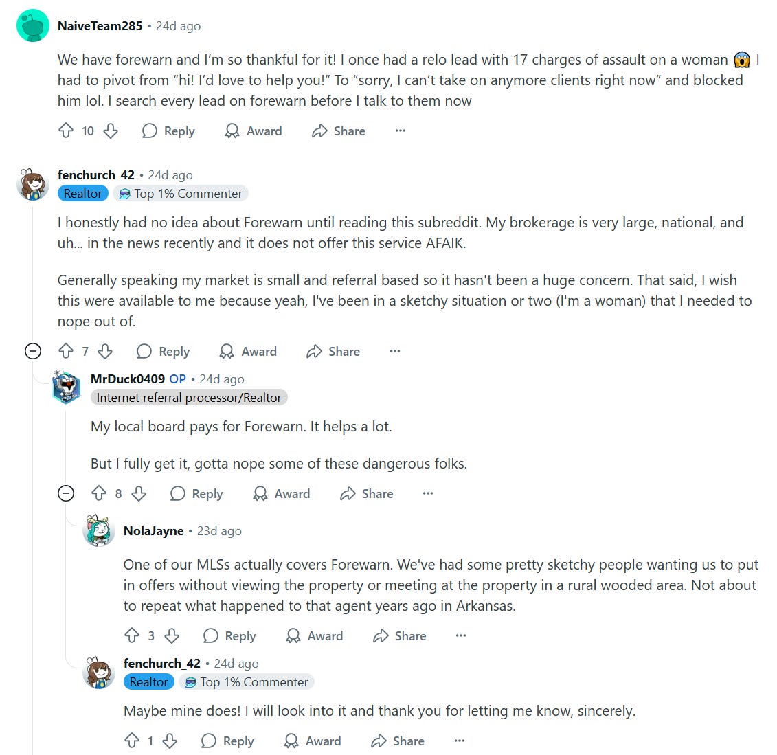 This testimony includes “My aunt is a realtor, she said FOREWARN is essentially mandatory,” and “All my real estate buddies swear by forewarn,” from folks I know on Twitter.