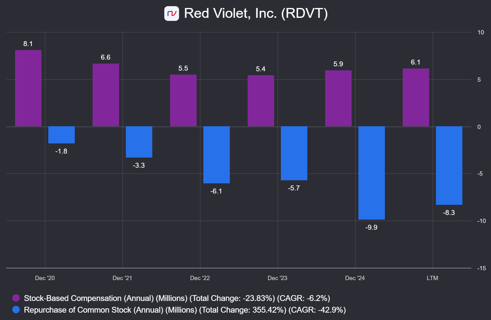 One thing that I think really sets RDVT apart from other software in both small and mid cap, is that they are not heavy dilutors. In 2024 SBC was under 8% of revenue which is generally ideal, and most quarters the company will buy back shares to counteract this issuance. Total shares outstanding have increased by less than 6% since 2022. You can contrast this to a lot of other software across the size spectrum where SBC is over 10%, even 15% of revenue, and dilution is much higher.